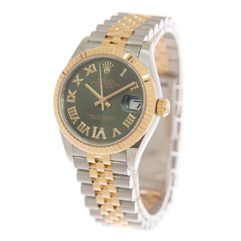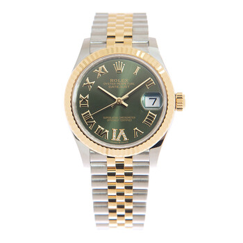 Stainless steel and 18kt yellow gold case with a stainless steel and 18kt yellow gold jubilee bracelet. Fixed bezel. Olive green dial with yellow gold hands and Roman numeral hour markers. Dial Type: Analog. Date display at the 3 o'clock position. Rolex Calibre 2236 automatic movement with a 55-hour power reserve. Scratch resistant sapphire crystal. Screw down crown. Solid case back. Round case shape. Case size: 31 mm. Water resistant at 100 meters / 330 feet. Functions: date, hour, minute, second. Luxury watch style. Watch label: Swiss Made. Rolex Datejust 31 Olive Green Diamond Dial Ladies Automatic Steel and 18kt Yellow Gold Jubilee Watch 278273GNRDJ.