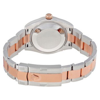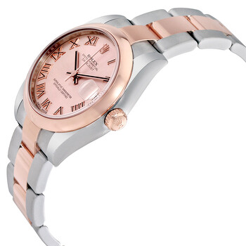 Stainless steel case with a stainless steel Rolex oyster bracelet with 18kt rose gold center links. Fixed domed 18kt rose gold bezel. Pink dial with rose gold hands and Roman numeral hour markers. Dial Type: Analog. Date display at the 3 o'clock position. Automatic movement. Scratch resistant sapphire crystal. Screw down crown. Solid case back. Case size: 31 mm. Round case shape. Oysterlock clasp. Water resistant at 100 meters / 330 feet. Functions: date, hour, minute, second. Luxury watch style. Watch label: Swiss Made. Rolex Datejust 31 Pink Dial Steel and 18K Rose Gold Oyster Ladies Watch 178241PRO.