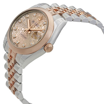 Stainless steel case with a stainless steel Rolex jubilee bracelet with 18kt everose gold center links. Fixed domed 18kt everose gold bezel. Pink jubilee dial with rose gold hands and diamond hour markers. Dial Type: Analog. Date display at the 3 o'clock position. Automatic movement. Scratch resistant sapphire crystal. Screw down crown. Solid case back. Case size: 31 mm. Round case shape. Concealed crown clasp. Water resistant at 100 meters / 330 feet. Functions: date, hour, minute, second. Luxury watch style. Watch label: Swiss Made. Rolex Datejust 31 Pink Jubilee Diamond Dial Steel and 18K Everose Gold Ladies Watch 178241PKJDJ.