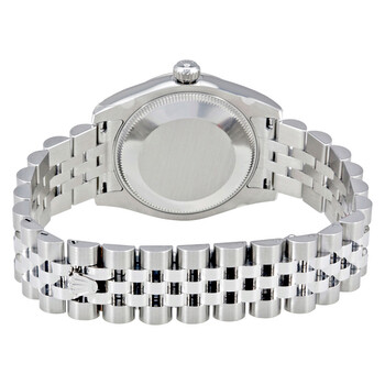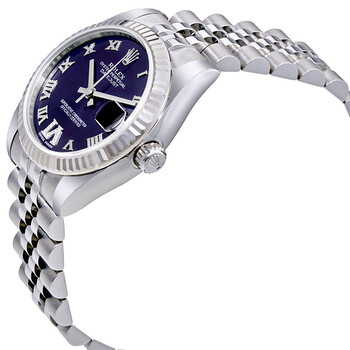 Stainless steel case with a stainless steel Rolex Jubilee bracelet. Fixed fluted 18k white gold bezel. Purple dial with silver-tone hands and Roman numeral hour markers. Diamond-filled VI Roman numera. Dial Type: Analog. Date display at the 6 o'clock position. Automatic movement with a 48-hour power reserve. Scratch resistant sapphire crystal. Screw down crown. Solid case back. Case size: 31 mm. Round case shape. Concealed crown clasp. Water resistant at 100 meters / 330 feet. Functions: date, hour, minute, second. Luxury watch style. Watch label: Swiss Made. Rolex Datejust 31 Purple Dial Diamond Stainless Steel 18K White Gold Ladies Watch 178274PURDJ.
