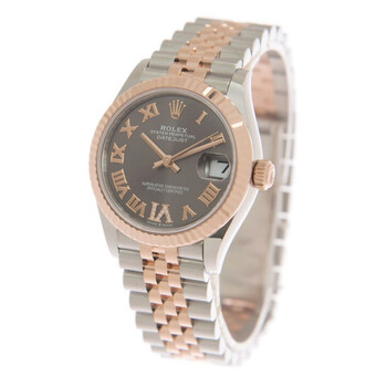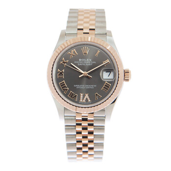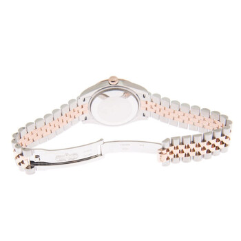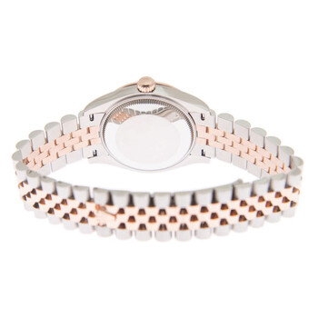 Stainless steel case with a stainless steel jubilee bracelet with 18kt everose gold center links. Fixed fluted 18kt everose gold bezel. Rhodium dial with everose gold hands and Roman numeral hour markers. Dial Type: Analog. Date display at the 3 o'clock position. Rolex calibre 2236 automatic movement, based upon Rolex 2235, containing 31 Jewels, bitting at 28800 vph, and has a power reserve of approximately 55 hours. Scratch resistant sapphire crystal. Screw down crown. Solid case back. Round case shape. Case size: 31 mm. Fold over clasp. Water resistant at 100 meters / 330 feet. Functions: date, hour, minute, second. Datejust 31 Series. Luxury watch style. Watch label: Swiss Made. Rolex Datejust 31 Rhodium Diamond Dial Automatic Ladies Steel and 18kt Everose Gold Jubilee Watch 278271DRRDJ.