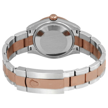 Stainless steel case with a stainless steel oyster bracelet with everose gold center links. Fixed everose gold bezel set with diamonds. Rose dial with everose gold hands and diamond hour markers. Dial Type: Analog. Date display at the 3 o'clock position. Rolex calibre 2236 automatic movement, based upon Rolex 2235, containing 31 Jewels, bitting at 28800 vph, and has a power reserve of approximately 55 hours. Scratch resistant sapphire crystal. Screw down crown. Solid case back. Round case shape. Case size: 31 mm. Fold over oyster clasp. Water resistant at 100 meters / 330 feet. Functions: date, hour, minute, second. Datejust 31 Series. Luxury watch style. Watch label: Swiss Made. Rolex Datejust 31 Rose Diamond Dial Automatic Ladies Steel and Everose Gold Oyster Watch 278381PDO.
