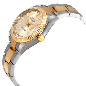 Silver-tone stainless steel case with a silver-tone stainless steel and 18kt everose gold rolex oyster bracelet. Fixed fluted 18kt everose gold bezel. Silver dial with rose gold-tone hands and index / Roman numeral hour markers. Minute markers around the outer rim. Dial Type: Analog. Date display at the 3 o'clock position. Rolex Calibre 2235 automatic movement with a 48-hour power reserve. Scratch resistant sapphire crystal. Screw down crown. Solid case back. Round case shape. Case size: 31 mm. Oysterlock clasp. Water resistant at 100 meters / 330 feet. Functions: date, hour, minute, second, chronometer. Luxury watch style. Watch label: Swiss Made. Rolex Datejust 31 Silver Automatic Ladies Watch 178273SSO.