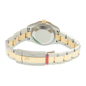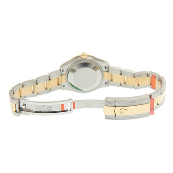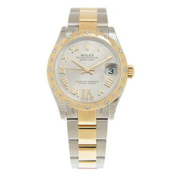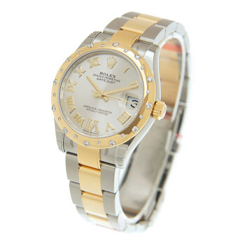 Stainless steel case with a stainless steel Rolex oyster bracelet with 18kt yellow gold center links. Fixed 18kt yellow gold bezel set with diamonds. Silver dial with yellow gold hands and Roman numeral hour markers. A diamond-set Roman numeral at the 6 o'clock position. Dial Type: Analog. Date display at the 3 o'clock position. Rolex calibre 2236 automatic movement, based upon Rolex 2235, containing 31 Jewels, bitting at 28800 vph, and has a power reserve of approximately 55 hours. Scratch resistant sapphire crystal. Screw down crown. Solid case back. Round case shape. Case size: 31 mm. Fold over oyster clasp. Water resistant at 100 meters / 330 feet. Functions: date, hour, minute, second. Datejust 31 Series. Luxury watch style. Watch label: Swiss Made. Rolex Datejust 31 Silver Dial Automatic Ladies Steel and 18kt Yellow Gold Oyster Watch 278343SRDO.