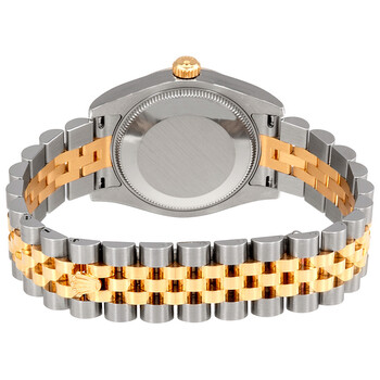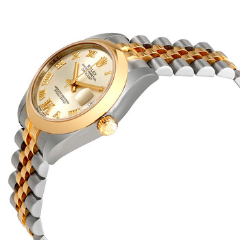 Silver-tone stainless steel case with a two-tone (gold-tone and silver-tone) stainless steel and 18kt yellow gold rolex jubilee bracelet. Fixed domed 18kt yellow gold bezel. Silver dial with yellow gold-tone hands and Roman numeral hour markers. Dial Type: Analog. Date display at the 3 o'clock position. Rolex Calibre 2235 automatic movement with a 48-hour power reserve. Scratch resistant sapphire crystal. Screw down crown. Solid case back. Round case shape. Case size: 31 mm. Crown clasp. Water resistant at 100 meters / 330 feet. Functions: date, hour, minute, second, chronometer. Luxury watch style. Watch label: Swiss Made. Rolex Datejust 31 Silver Dial Steel and 18K Yellow Gold Ladies Watch 178243SRDJ.