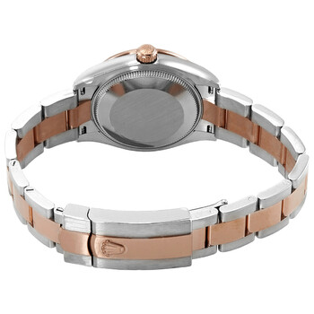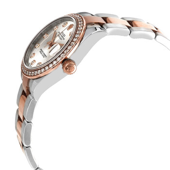 Stainless steel case with a stainless steel oyster bracelet with 18kt everose gold center links. Fixed 8kt everose gold bezel set with diamonds. Silver dial with everose gold hands and diamond hour markers. Dial Type: Analog. Date display at the 3 o'clock position. Rolex calibre 2236 automatic movement, based upon Rolex 2235, containing 31 Jewels, bitting at 28800 vph, and has a power reserve of approximately 55 hours. Scratch resistant sapphire crystal. Screw down crown. Solid case back. Round case shape. Case size: 31 mm. Fold over clasp. Water resistant at 100 meters / 330 feet. Functions: date, hour, minute, second. Datejust 31 Series. Luxury watch style. Watch label: Swiss Made. Rolex Datejust 31 Silver Diamond Dial Automatic Ladies Steel and 18kt Everose Gold Oyster Watch 278381SDO.