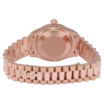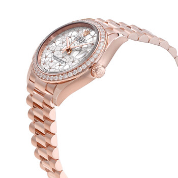 18kt everose gold case with a 18kt everose gold president bracelet. Fixed, fluted 18kt everose gold bezel. Silver floral motif dial with everose gold hands. Dial Type: Analog. Date display at the 3 o'clock position. Rolex Calibre 2236 Automatic movement, based upon Rolex 2235, containing 31 Jewels, bitting at 28800 vph, and has a power reserve of approximately 55 hours. Scratch resistant sapphire crystal. Screw down crown. Solid case back. Round case shape, case size: 31 mm. Concealed folding crown clasp. Water resistant at 100 meters / 330 feet. Functions: date, hour, minute, second. Additional Info: dial set with 24 diamonds in 18 ct gold settings. Datejust 31 Series. Luxury watch style. Watch label: Swiss Made. Rolex Datejust 31 Silver Floral Motif Diamond Dial Ladies 18kt Everose Gold President Watch M278285rbr-0036.