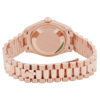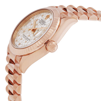 18kt everose gold case with a 18kt everose gold rolex president bracelet. Fixed, fluted 18kt everose gold bezel. Silver floral motif dial with everose gold hands. Dial Type: Analog. Date display at the 3 o'clock position. Rolex Calibre 2236 Automatic movement, based upon Rolex 2235, containing 31 Jewels, bitting at 28800 vph, and has a power reserve of approximately 55 hours. Scratch resistant sapphire crystal. Screw down crown. Solid case back. Round case shape, case size: 31 mm. Concealed folding clasp. Water resistant at 100 meters / 330 feet. Functions: date, hour, minute, second. Additional Info: dial set with 24 diamonds. Datejust 31 Series. Luxury watch style. Watch label: Swiss Made. Rolex Datejust 31 Silver Floral-Motif Diamond Dial Automatic Ladies 18kt Everose Gold President Watch M278275-0045.