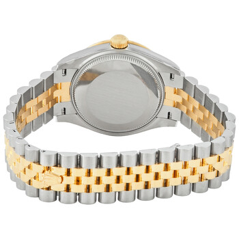 Stainless steel case with a stainless steel Rolex jubilee bracelet with 18kt yellow gold center links. Fixed 18kt yellow gold set with diamonds bezel. White dial with yellow gold hands and Roman numeral hour markers. Dial Type: Analog. Date display at the 3 o'clock position. Rolex calibre 2236 automatic movement, based upon Rolex 2235, containing 31 Jewels, bitting at 28800 vph, and has a power reserve of approximately 55 hours. Scratch resistant sapphire crystal. Screw down crown. Solid case back. Round case shape. Case size: 31 mm. Fold over oyster clasp. Water resistant at 100 meters / 330 feet. Functions: date, hour, minute, second. Luxury watch style. Watch label: Swiss Made. Rolex Datejust 31 White Dial Automatic Ladies Steel and 18kt Yellow Gold Jubilee Watch 278343WRJ.