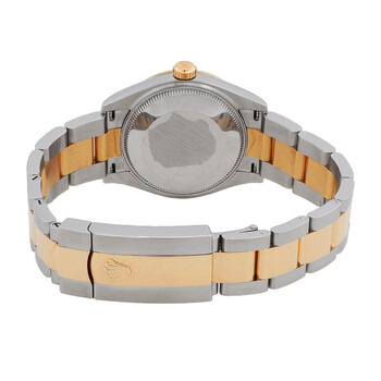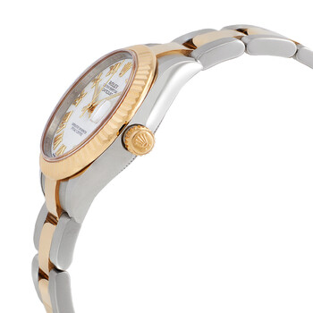 Stainless steel and 18kt yellow gold case with a stainless steel and 18kt yellow gold oyster bracelet. Fixed-fluted bezel. White dial with yellow gold hands and Roman numeral hour markers. Dial Type: Analog. Date display at the 3 o'clock position. Rolex Calibre 2236 automatic movement with a 55-hour power reserve. Scratch resistant sapphire crystal. Screw down crown. Solid case back. Round case shape. Case size: 31 mm. Water resistant at 100 meters / 330 feet. Functions: date, hour, minute, second. Luxury watch style. Watch label: Swiss Made. Rolex Datejust 31 White Dial Automatic Ladies Steel and 18kt Yellow Gold Oyster Watch 278273WRO.
