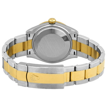 Stainless steel case with a stainless steel Rolex oyster bracelet with 18kt yellow gold center links. Fixed 18kt yellow gold bezel set with diamonds. White dial with yellow gold hands and Roman numeral hour markers. Dial Type: Analog. Date display at the 3 o'clock position. Rolex calibre 2236 automatic movement, based upon Rolex 2235, containing 31 Jewels, bitting at 28800 vph, and has a power reserve of approximately 55 hours. Scratch resistant sapphire crystal. Screw down crown. Solid case back. Round case shape. Case size: 31 mm. Oyster clasp. Water resistant at 100 meters / 330 feet. Functions: date, hour, minute, second. Datejust 31 Series. Luxury watch style. Watch label: Swiss Made. Rolex Datejust 31 White Dial Automatic Ladies Steel and 18kt Yellow Gold Oyster Watch 278383WRO.