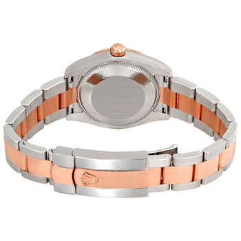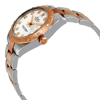 Stainless steel case with a stainless steel Rolex oyster bracelet with 18kt everose gold center links. Fixed domed 18kt everose gold bezel. White dial with 18kt everose gold hands and diamond hour markers. Dial Type: Analog. Date display at the 3 o'clock position. Rolex calibre 2235 automatic movement with a 48-hour power reserve. Scratch resistant sapphire crystal. Screw down crown. Solid case back. Round case shape. Case size: 31 mm. Oysterlock clasp. Water resistant at 100 meters / 330 feet. Functions: date, hour, minute, second, chronometer. Luxury watch style. Watch label: Swiss Made. Rolex Datejust 31 White Diamond Dial Ladies Steel and 18K Everose Gold Oyster Watch 178341WDO.