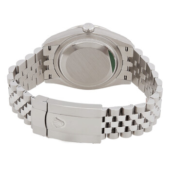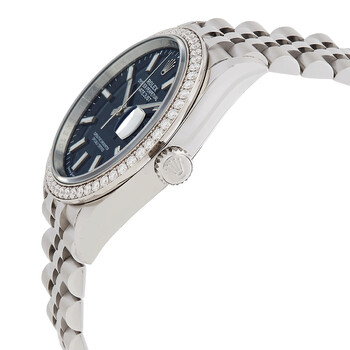 Silver-tone stainless steel case with a silver-tone stainless steel jubilee bracelet. Silver-tone diamond set bezel. Blue fluted dial with silver-tone hands and index hour markers. Dial Type: Analog. Luminescent hands and markers. Date display at the 3 o'clock position. Rolex Calibre 3235 Automatic movement, based upon Rolex 3035, containing 31 Jewels, bitting at 28800 vph, and has a power reserve of approximately 70 hours. Scratch resistant sapphire crystal. Screw down crown. Screw down case back. Round case shape, case size: 36 mm. Folding with 5 mm comfort extension link clasp. Water resistant at 100 meters / 330 feet. Functions: date, hour, minute, second, chronometer. Datejust 36 Series. Luxury watch style. Watch label: Swiss Made. Rolex Datejust 36 Automatic Chronometer Diamond Watch 126284BLFSJ.