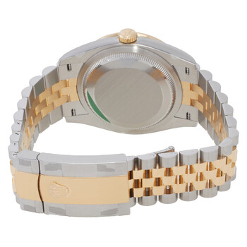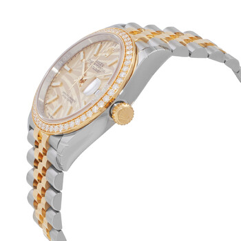Stainless steel & 18k yellow gold case with a stainless steel jubilee & 18k yellow gold bracelet. Diamond set bezel. Champagne palm motif dial with 18k yellow gold hands and index hour markers. Dial Type: Analog. Luminescent hands and markers. Date display at the 3 o'clock position. Rolex Calibre 3235 Automatic movement, based upon Rolex 3035, containing 31 Jewels, bitting at 28800 vph, and has a power reserve of approximately 70 hours. Scratch resistant sapphire crystal. Screw down crown. Screw down case back. Round case shape, case size: 36 mm. Folding with 5 mm comfort extension link clasp. Water resistant at 100 meters / 330 feet. Functions: date, hour, minute, second, chronometer. Datejust 36 Series. Dress watch style. Watch label: Swiss Made. Rolex Datejust 36 Automatic Champagne Palm Motif Dial Chronometer Diamond Watch 126283CSPLMJ.