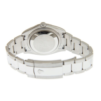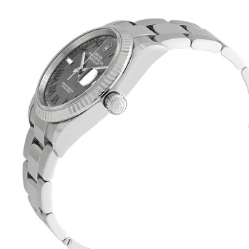 Stainless steel & 18k white gold case with a stainless steel oyster bracelet. Fluted silver-tone bezel. Grey dial with silver-tone hands and Roman numeral, index at the 9 o'clock hour markers. Dial Type: Analog. Luminescent hands and marker. Date display at the 3 o'clock position. Rolex Calibre 3235 Automatic movement, based upon Rolex 3035, containing 31 Jewels, bitting at 28800 vph, and has a power reserve of approximately 70 hours. Scratch resistant sapphire crystal. Screw down crown. Screw down case back. Round case shape, case size: 36 mm. Folding with 5 mm comfort extension link clasp. Water resistant at 100 meters / 330 feet. Functions: date, hour, minute, second, chronometer. Datejust 36 Series. Luxury watch style. Watch label: Swiss Made. Rolex Datejust 36 Automatic Chronometer Grey Dial Watch 126234GYRO.
