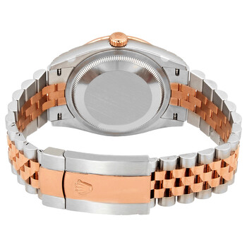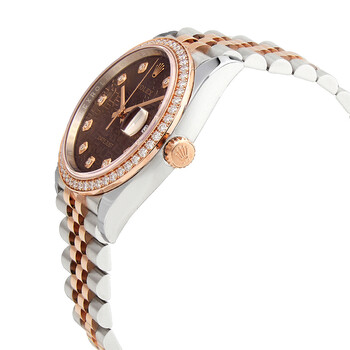 Stainless steel case with a stainless steel Rolex jubilee bracelet with 18kt everose gold center links. Fixed 18kt everose gold bezel set with diamonds. Brown dial with rose gold-tone hands and diamond hour markers. Dial Type: Analog. Date display at the 3 o'clock position. Caliber 3235 automatic movement with a 70-hour power reserve. Scratch resistant sapphire crystal. Screw down crown. Solid case back. Round case shape. Case size: 36 mm. Rolex fold over oyster clasp. Water resistant at 100 meters / 330 feet. Functions: date, hour, minute, second. Datejust 36 Series. Dress watch style. Watch label: Swiss Made. Rolex Datejust 36 Automatic Diamond Brown Dial Watch 126281CHDJ.