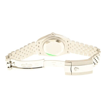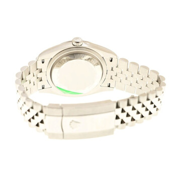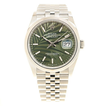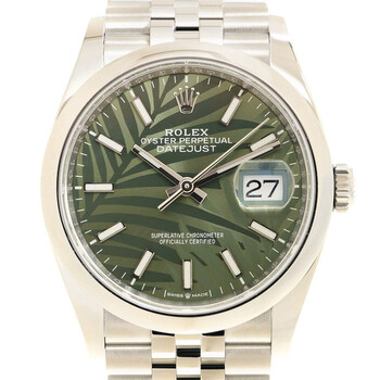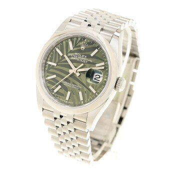 Silver-tone stainless steel case with a silver-tone stainless steel jubilee bracelet. Domed silver-tone stainless steel bezel. Olive green palm dial with silver-tone hands and 18k gold index hour markers. Dial Type: Analog. Luminescent hands and markers. Date display at the 3 o'clock position. Rolex Calibre 3235 Automatic movement, based upon Rolex 3035, containing 31 Jewels, bitting at 28800 vph, and has a power reserve of approximately 70 hours. Scratch resistant sapphire crystal. Screw down crown. Screw-down case back. Round case shape, case size: 36 mm. Folding with 5 mm comfort extension link clasp. Water resistant at 100 meters / 330 feet. Functions: date, hour, minute, second, chronometer. Datejust 36 Series. Luxury watch style. Watch label: Swiss Made. Rolex Datejust 36 Automatic Chronometer Ladies Watch 126200GNSPLMJ.