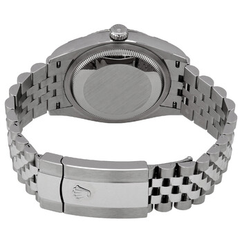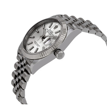 Stainless steel case with a stainless steel Rolex jubilee bracelet. Fixed fluted 18kt white gold bezel. Silver dial with luminous silver-tone hands and index hour markers. Minute markers around the outer rim. Dial Type: Analog. Luminescent hands and markers. Date display at the 3 o'clock position. Rolex calibre 3235 automatic movement with a 70-hour power reserve. Scratch resistant sapphire crystal. Screw down crown. Solid case back. Round case shape. Case size: 36 mm. Oysterlock clasp. Water resistant at 100 meters / 330 feet. Functions: date, hour, minute, second. Luxury watch style. Watch label: Swiss Made. Rolex Datejust 36 Automatic Silver Dial Ladies Jubilee Watch 126234SRDJ.