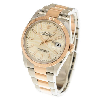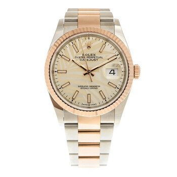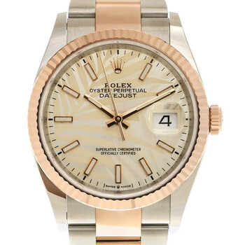 Stainless steel & 18k everose gold case with a stainless steel oyster & 18k everose gold bracelet. Fluted 18k everose gold bezel. Silver palm dial with 18k everose gold hands and index hour markers. Dial Type: Analog. Luminescent hands and markers. Date display at the 3 o'clock position. Rolex Calibre 3235 Automatic movement, based upon Rolex 3035, containing 31 Jewels, bitting at 28800 vph, and has a power reserve of approximately 70 hours. Scratch resistant sapphire crystal. Screw down crown. Screw down case back. Round case shape, case size: 36 mm. Folding with 5 mm comfort extension link clasp. Water resistant at 100 meters / 330 feet. Functions: date, hour, minute, second, chronometer. Datejust 36 Series. Luxury watch style. Watch label: Swiss Made. Rolex Datejust 36 Automatic Chronometer Watch 126231SSPLMO.