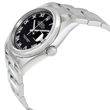 Stainless steel case with a stainless steel Rolex oyster bracelet. Fixed domed stainless steel bezel. Black dial with silver-tone hands and Roman numeral hour markers. Minute markers around the outer rim. Dial Type: Analog. Date display at the 3 o'clock position. Automatic movement with a 50-hour power reserve. Scratch resistant sapphire crystal. Screw down crown. Solid case back. Case diameter: 36 mm. Round case shape. Deployment clasp. Water resistant at 100 meters / 330 feet. Functions: date, hour, minute, second. Luxury watch style. Watch label: Swiss Made. Item Variations: 116200, 116200-BKRO, Rolex-116200, Rolex-116200-BKRO. Rolex Datejust 36 Black Dial Stainless Steel Rolex Oyster Automatic Men's Watch 116200BKRO.