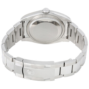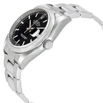 Stainless steel case with a stainless steel Rolex oyster bracelet. Fixed domed stainless steel bezel. Black dial with silver-tone hands and luminous stick/ Roman numeral hour markers. Minute markers around the outer rim. Dial Type: Analog. Date display at the 3 o'clock position. Automatic movement with a 50-hour power reserve. Scratch resistant sapphire crystal. Screw down crown. Solid case back. Case diameter: 36 mm. Round case shape. Deployment clasp. Water resistant at 100 meters / 330 feet. Functions: date, hour, minute, second. Luxury watch style. Watch label: Swiss Made. Item Variations: 116200, 116200-BKSO, Rolex-116200, Rolex-116200-BKSO. Rolex Datejust 36 Black Dial Stainless Steel Rolex Oyster Automatic Men's Watch 116200BKSO.