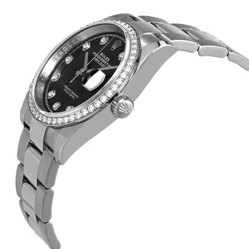 Stainless steel case with a stainless steel Rolex oyster bracelet. Fixed stainless steel bezel set with diamonds. Black dial with silver-tone hands and diamond hour markers. Minute markers around the outer rim. Dial Type: Analog. Date display at the 3 o'clock position. Rolex calibre 3235 automatic movement, based upon Rolex 3035, containing 31 Jewels, bitting at 28800 vph, and has a power reserve of approximately 70 hours. Scratch resistant sapphire crystal. Screw down crown. Solid case back. Round case shape. Case size: 36 mm. Fold over clasp. Water resistant at 100 meters / 330 feet. Functions: date, hour, minute, second. Datejust 36 Series. Luxury watch style. Watch label: Swiss Made. Rolex Datejust 36 Black Diamond Dial Automatic Unisex Oyster Watch 126284BKDO.