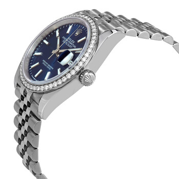 Stainless steel case with a stainless steel Rolex jubilee bracelet. Fixed stainless steel bezel set with diamonds. Blue dial with luminous silver-tone hands and index hour markers. Minute markers around the outer rim. Dial Type: Analog. Luminescent hands and markers. Date display at the 3 o'clock position. Rolex calibre 3235 automatic movement, based upon Rolex 3035, containing 31 Jewels, bitting at 28800 vph, and has a power reserve of approximately 70 hours. Scratch resistant sapphire crystal. Screw down crown. Solid case back. Round case shape. Case size: 36 mm. Fold over clasp. Water resistant at 100 meters / 330 feet. Functions: date, hour, minute, second. Datejust 36 Series. Luxury watch style. Watch label: Swiss Made. Rolex Datejust 36 Blue Dial Automatic Unisex Jubilee Watch 126284BLSJ.
