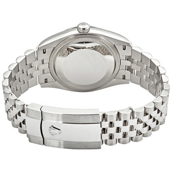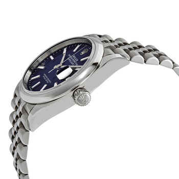 Stainless steel case with a stainless steel Rolex jubilee bracelet. Fixed domed stainless steel bezel. Blue dial with luminous silver-tone hands and index hour markers. Minute markers around the outer rim. Dial Type: Analog. Luminescent hands and markers. Date display at the 3 o'clock position. Rolex calibre 3235 automatic movement, based upon Rolex 3035, containing 31 Jewels, bitting at 28800 vph, and has a power reserve of approximately 70 hours. Scratch resistant sapphire crystal. Screw down crown. Solid case back. Round case shape. Case size: 36 mm. Fold over oyster clasp. Water resistant at 100 meters / 330 feet. Functions: date, hour, minute, second. Datejust 36 Series. Luxury watch style. Watch label: Swiss Made. Rolex Datejust 36 Blue Dial Men's Watch 126200BLSJ.