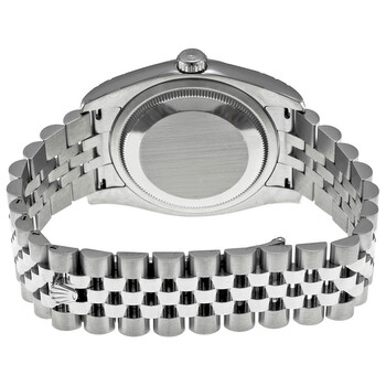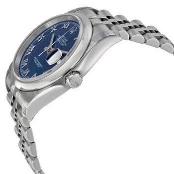 Stainless steel case with a stainless steel Rolex jubilee bracelet. Fixed domed stainless steel bezel. Blue dial with silver-tone hands and Roman numeral hour markers. Minute markers around the outer rim. Dial Type: Analog. Date display at the 3 o'clock position. Automatic movement with a 50-hour power reserve. Scratch resistant sapphire crystal. Screw down crown. Solid case back. Case diameter: 36 mm. Round case shape. Concealed crown clasp. Water resistant at 100 meters / 330 feet. Functions: date, hour, minute, second. Casual watch style. Watch label: Swiss Made. Rolex Datejust 36 Blue Dial Stainless Steel Rolex Jubilee Automatic Men's Watch 116200BLRJ.