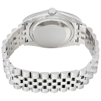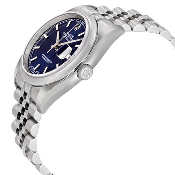 Stainless steel case with a stainless steel Rolex jubilee bracelet. Fixed domed stainless steel bezel. Blue dial with silver-tone hands and luminous stick / Roman numerals hour markers. Minute markers around the outer rim. Dial Type: Analog. Luminescent hands and dial markers. Date display at the 3 o'clock position. Automatic movement with a 50-hour power reserve. Scratch resistant sapphire crystal. Screw down crown. Solid case back. Case diameter: 36 mm. Round case shape. Fold over hidden clasp. Water resistant at 100 meters / 330 feet. Functions: date, hour, minute, second. Additional Info: date displays at 3 o'clock position. Luxury watch style. Watch label: Swiss Made. Item Variations: 116200, 116200-BLSJ, Rolex-116200, Rolex-116200-BLSJ. Rolex Datejust 36 Blue Dial Stainless Steel Rolex Jubilee Automatic Men's Watch 116200BLSJ.