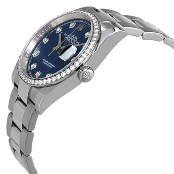 Stainless steel case with a stainless steel Rolex oyster bracelet. Fixed stainless steel bezel set with diamonds. Blue dial with silver-tone hands and diamond hour markers. Minute markers around the outer rim. Dial Type: Analog. Date display at the 3 o'clock position. Rolex calibre 3235 automatic movement, based upon Rolex 3035, containing 31 Jewels, bitting at 28800 vph, and has a power reserve of approximately 70 hours. Scratch resistant sapphire crystal. Screw down crown. Solid case back. Round case shape. Case size: 36 mm. Fold over clasp. Water resistant at 100 meters / 330 feet. Functions: date, hour, minute, second. Datejust 36 Series. Luxury watch style. Watch label: Swiss Made. Rolex Datejust 36 Blue Diamond Dial Automatic Unisex Oyster Watch 126284BLDO.