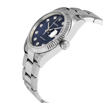 Stainless steel case with a stainless steel Rolex oyster bracelet. Fixed fluted 18kt white gold bezel. Blue jubilee dial with silver-tone hands and diamond hour markers. Dial Type: Analog. Date display at the 3 o'clock position. Rolex calibre 3235 automatic movement, based upon Rolex 3035, containing 31 Jewels, bitting at 28800 vph, and has a power reserve of approximately 70 hours. Scratch resistant sapphire crystal. Screw down crown. Solid case back. Round case shape. Case size: 36 mm. Oysterlock clasp. Water resistant at 100 meters / 330 feet. Functions: date, hour, minute, second. Luxury watch style. Watch label: Swiss Made. Rolex Datejust 36 Blue Jubilee Diamond Dial Ladies Oyster Watch 126234BLJDO.
