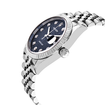 Stainless steel case with a stainless steel Rolex jubilee bracelet. Fixed fluted 18kt white gold bezel. Blue jubilee dial with silver-tone hands and diamond hour markers. Dial Type: Analog. Date display at the 3 o'clock position. Rolex calibre 3235 automatic movement, based upon Rolex 3035, containing 31 Jewels, bitting at 28800 vph, and has a power reserve of approximately 70 hours. Scratch resistant sapphire crystal. Screw down crown. Solid case back. Round case shape. Case size: 36 mm. Oysterlock clasp. Water resistant at 100 meters / 330 feet. Functions: date, hour, minute, second. Luxury watch style. Watch label: Swiss Made. Rolex Datejust 36 Blue Jubilee Diamond Dial Ladies Watch 126234BLJDJ.
