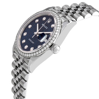 Stainless steel case with a stainless steel Rolex jubilee bracelet. Fixed stainless steel bezel set with diamonds. Blue jubilee dial with silver-tone hands and diamond hour markers. Dial Type: Analog. Date display at the 3 o'clock position. Rolex calibre 3235 automatic movement, based upon Rolex 3035, containing 31 Jewels, bitting at 28800 vph, and has a power reserve of approximately 70 hours. Scratch resistant sapphire crystal. Screw down crown. Solid case back. Round case shape. Case size: 36 mm. Foldi over clasp. Water resistant at 100 meters / 330 feet. Functions: date, hour, minute, second. Datejust 36 Series. Luxury watch style. Watch label: Swiss Made. Rolex Datejust 36 Blue Jubilee Diamond Diall Automatic Unisex Watch 126284BLJDJ.