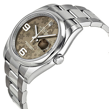 Stainless steel case with a stainless steel Rolex oyster bracelet. Fixed domed stainless steel bezel. Brown floral dial with silver-tone hands. Arabic numerals mark the 6 and 9 o'clock positions. Dial Type: Analog. Date display at the 3 o'clock position. Automatic movement with a 50-hour power reserve. Scratch resistant sapphire crystal. Screw down crown. Case diameter: 36 mm. Round case shape. Fold over clasp. Water resistant at 100 meters / 330 feet. Functions: date, hour, minute, second. Luxury watch style. Watch label: Swiss Made. Rolex Datejust 36 Brown Floral Dial Stainless Steel Rolex Oyster Automatic Ladies Watch 116200BRFAO.
