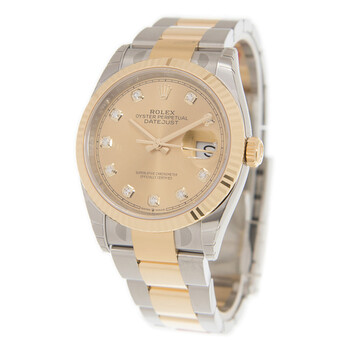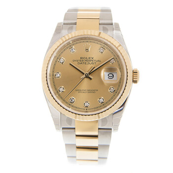 Stainless steel and 18kt yellow gold case with a stainless steel and 18kt yellow gold rolex oyster bracelet. Fixed- fluted bezel. Champagne dial with yellow gold hands and diamonds hour markers. Dial Type: Analog. Date display at the 3 o'clock position. Rolex Calibre 3235 automatic movement with a 70-hour power reserve. Scratch resistant sapphire crystal. Screw down crown. Solid case back. Round case shape. Case size: 36 mm. Water resistant at 100 meters / 330 feet. Functions: date, hour, minute, second. Luxury watch style. Watch label: Swiss Made. Rolex Datejust 36 Champagne Diamond Dial Men's Steel and 18kt Yellow Gold Oyster Watch 126233CDO.