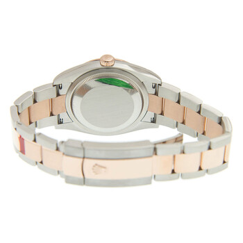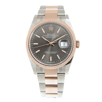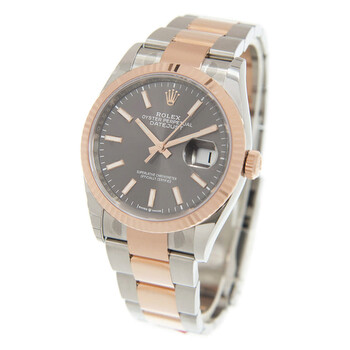 Stainless steel and 18k everose gold case with a stainless steel and 18k everose gold oyster bracelet. Fixed-fluted bezel. Dark rhodium dial with rose gold-tone hands and index hour markers. Dial Type: Analog. Luminescent hands and markers. Date display at the 3 o'clock position. Rolex Calibre 3235 automatic movement with a 70-hour power reserve. Scratch resistant mineral crystal. Screw down crown. Solid case back. Round case shape. Case size: 36 mm. Water resistant at 100 meters / 330 feet. Functions: date, hour, minute, second. Luxury watch style. Watch label: Swiss Made. Rolex Datejust 36 Dark Rhodium Dial Automatic Men's Steel and 18k Everose Gold Oyster Watch 126231DRSO.