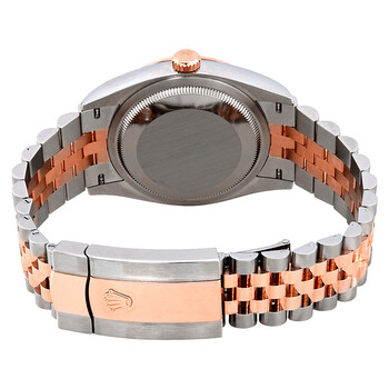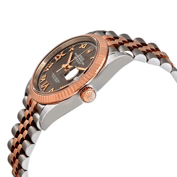 Stainless steel and 18kt everose gold case with a stainless steel and 18kt everose gold rolex jubile bracelet. Fixed-fluted bezel. Dark rhodium dial with everose gold hands and Roman numeral hour markers. Dial Type: Analog. Date display at the 3 o'clock position. Rolex Calibre 3235 automatic movement with a 70-hour power reserve. Scratch resistant sapphire crystal. Screw down crown. Solid case back. Round case shape. Case size: 36 mm. Water resistant at 100 meters / 330 feet. Functions: date, hour, minute, second. Luxury watch style. Watch label: Swiss Made. Rolex Datejust 36 Dark Rhodium Diamond Dial Steel and 18kt Everose Gold Jubilee Watch 126231DRRDJ.