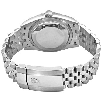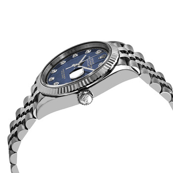 Stainless steel case with a stainless steel Rolex jubilee bracelet. Fixed fluted 18kt white gold bezel. Blue dial with silver-tone hands and diamond hour markers. Dial Type: Analog. Date display at the 3 o'clock position. Rolex calibre 3235 automatic movement with a 70-hour power reserve. Scratch resistant sapphire crystal. Screw down crown. Solid case back. Round case shape. Case size: 36 mm. Oysterlock clasp. Water resistant at 100 meters / 330 feet. Functions: date, hour, minute, second. Luxury watch style. Watch label: Swiss Made. Rolex Datejust 36 Automatic Blue Diamond Dial Ladies Jubilee Watch 126234BLDJ.