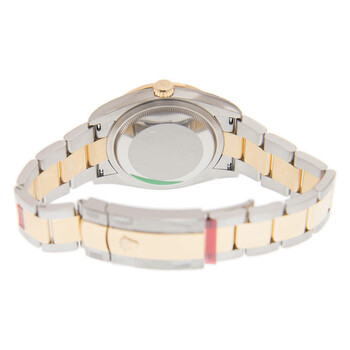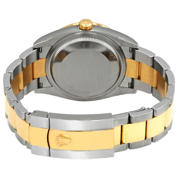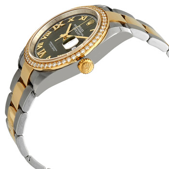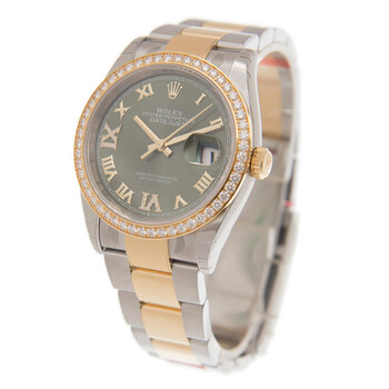 Stainless steel and 18kt yellow gold case with a two-tone (silver-tone and gold-tone) stainless steel and 18kt yellow gold rolex oyster bracelet. Fixed 18kt yellow gold diamond set bezel. Green dial with yellow gold hands and Roman numeral hour markers. Dial Type: Analog. Date display at the 3 o'clock position. Rolex Calibre 3235 Automatic movement, based upon Rolex 3035, containing 31 Jewels, bitting at 28800 vph, and has a power reserve of approximately 70 hours. Scratch resistant sapphire crystal. Screw down crown. Solid case back. Round case shape. Case size: 36 mm. Oyster clasp. Water resistant at 100 meters / 330 feet. Functions: date, hour, minute, second. Luxury watch style. Watch label: Swiss Made. Rolex Datejust 36 Green Diamond Dial Men's Steel and 18kt Yellow Gold Watch 126283GNRDO.