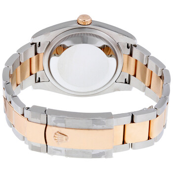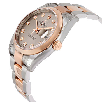Stainless steel case with a stainless steel Rolex oyster bracelet with 18kt everose gold center links. Fixed domed 18kt everose gold bezel. Grey dial with rose gold hands and diamond hour markers. Dial Type: Analog. Date display at the 3 o'clock position. Automatic movement with a 50-hour power reserve. Scratch resistant sapphire crystal. Screw down crown. Solid case back. Case size: 36 mm. Round case shape. Oysterlock clasp. Water resistant at 100 meters / 330 feet. Functions: date, hour, minute, second. Luxury watch style. Watch label: Swiss Made. Rolex Datejust 36 Grey Diamond Dial Steel and 18K Everose Gold Oyster Men's Watch 116201GYDO.