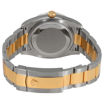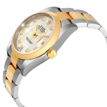 Stainless steel case with a stainless steel Rolex oyster bracelet with 18kt yellow gold center links. Fixed domed 18kt yellow gold bezel. Mother of pearl dial with yellow gold-tone hands and diamond hour markers. Minute markers around the outer rim. Dial Type: Analog. Date display at the 3 o'clock position. Rolex calibre 3135 automatic movement with a 50-hour power reserve. Scratch resistant sapphire crystal. Screw down crown. Solid case back. Case size: 36 mm. Round case shape. Oysterlock clasp. Water resistant at 100 meters / 330 feet. Functions: date, hour, minute, second, chronometer. Luxury watch style. Watch label: Swiss Made. Rolex Datejust 36 Mother of Pearl Dial Stainless Steel and 18K Yellow Gold Rolex Oyster Automatic Men's Watch 116203MDO.