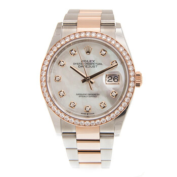 Stainless steel and 18k everose gold case with a stainless steel and 18k everose gold rolex oyster bracelet. Fixed bezel. Mother of pearl dial with everose gold hands and diamond hour markers. Dial Type: Analog. Date display at the 3 o'clock position. Rolex Calibre 3235 automatic movement with a 70-hour power reserve. Scratch resistant sapphire crystal. Screw down crown. Solid case back. Round case shape. Case size: 36 mm. Water resistant at 100 meters / 330 feet. Functions: date, hour, minute, second. Luxury watch style. Watch label: Swiss Made. Rolex Datejust 36 Mother of Pearl Diamond Dial Automatic Men's Steel and 18k Everose Gold Oyster Watch 126281MDO.