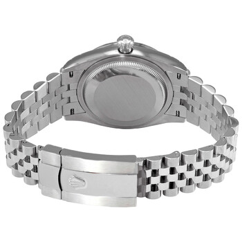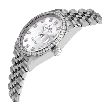 Stainless steel case with a stainless steel Rolex jubilee bracelet. Fixed stainless steel bezel set with diamonds. Mother of pearl dial with silver-tone hands and diamond hour markers. Dial Type: Analog. Date display at the 3 o'clock position. Rolex calibre 3235 automatic movement, based upon Rolex 3035, containing 31 Jewels, bitting at 28800 vph, and has a power reserve of approximately 70 hours. Scratch resistant sapphire crystal. Screw down crown. Solid case back. Round case shape. Case size: 36 mm. Fold over oyster clasp. Water resistant at 100 meters / 330 feet. Functions: date, hour, minute, second. Datejust 36 Series. Luxury watch style. Watch label: Swiss Made. Rolex Datejust 36 Mother of Pearl Diamond Dial Automatic Unisex Jubilee Watch 126284MDJ.