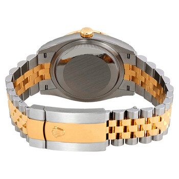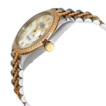 Stainless steel case with a stainless steel Rolex jubilee bracelet with 18kt yellow gold center links. Fixed 18kt yellow gold bezel set with diamonds. Mother of pearl dial with yellow gold hands and diamond hour markers. Dial Type: Analog. Date display at the 3 o'clock position. Rolex calibre 3235 automatic movement, based upon Rolex 3035, containing 31 Jewels, bitting at 28800 vph, and has a power reserve of approximately 70 hours. Scratch resistant sapphire crystal. Screw down crown. Solid case back. Round case shape. Case size: 36 mm. Oyster clasp. Water resistant at 100 meters / 330 feet. Functions: date, hour, minute, second. Datejust 36 Series. Luxury watch style. Watch label: Swiss Made. Rolex Datejust 36 Mother of Pearl Diamond Dial Ladies Steel and 18kt Yellow Gold Jubilee Watch 126283MDJ.