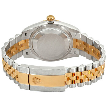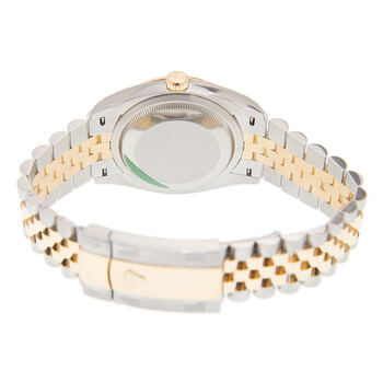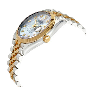 Stainless steel case with a stainless steel Rolex jubilee bracelet with 18kt yellow gold center links. Fixed fluted 18kt everose gold bezel. Mother of pearl dial with yellow gold hands and diamond hour markers. Minute markers around the outer rim. Dial Type: Analog. Date display at the 3 o'clock position. Rolex calibre 3235 Automatic movement, based upon Rolex 3035, containing 31 Jewels, bitting at 28800 vph, and has a power reserve of approximately 70 hours. Scratch resistant sapphire crystal. Screw down crown. Solid case back. Round case shape. Case size: 36 mm. Oyster clasp. Water resistant at 100 meters / 330 feet. Functions: date, hour, minute, second, chronometer. Datejust 36 Series. Luxury watch style. Watch label: Swiss Made. Item Variations: 126233-0023, 126233. Rolex Datejust 36 Mother of Pearl Diamond Dial Men's Watch 126233MDJ.