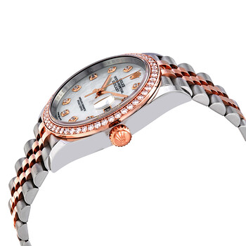 Stainless steel case with a stainless steel Rolex oyster bracelet with 18kt everose gold center links. Fixed everose gold bezel set with diamonds. Mother of pearl dial with everose gold hands and diamond hour markers. Dial Type: Analog. Date display at the 3 o'clock position. Rolex calibre 3235 automatic movement, based upon Rolex 3035, containing 31 Jewels, bitting at 28800 vph, and has a power reserve of approximately 70 hours. Scratch resistant sapphire crystal. Screw down crown. Solid case back. Round case shape. Case size: 36 mm. Crown clasp. Water resistant at 100 meters / 330 feet. Functions: date, hour, minute, second. Datejust 36 Series. Luxury watch style. Watch label: Swiss Made. Rolex Datejust 36 Mother of Pearl Diamond Dial Steel and 18k Everose Gold Jubilee Watch 126281MDO.
