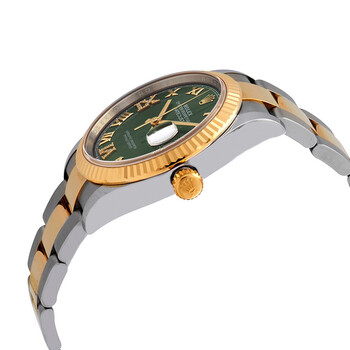 Stainless steel and 18kt yellow gold case with a stainless steel and 18kt yellow gold rolex oyster bracelet. Fixed, fluted bezel. Olive green dial with yellow gold hands and Roman numeral hour markers. Dial Type: Analog. Date display at the 3 o'clock position. Rolex Calibre 3235 automatic movement with a 70-hour power reserve. Scratch resistant sapphire crystal. Screw down crown. Solid case back. Round case shape. Case size: 36 mm. Water resistant at 100 meters / 330 feet. Functions: date, hour, minute, second. Luxury watch style. Watch label: Swiss Made. Rolex Datejust 36 Olive Green Diamond Dial Men's Stainless Steel and 18kt Yellow Gold Oyster Watch 126233GNRDO.