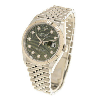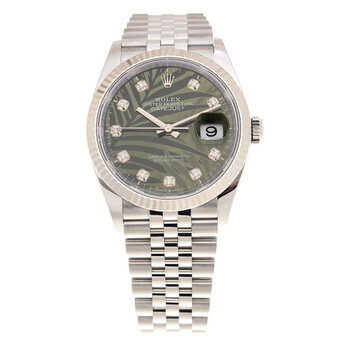 Oystersteel and white gold case with a oystersteel and white gold jubilee bracelet. Fixed, fluted bezel. Olive green palm motif dial with diamond hour markers. Dial Type: Analog. Date display at the 3 o'clock position. Rolex Calibre 3235 Automatic movement, based upon Rolex 3035, containing 31 Jewels, bitting at 28800 vph, and has a power reserve of approximately 70 hours. Scratch resistant sapphire crystal. Screw down crown. Solid case back. Round case shape, case size: 36 mm. Folding oyster clasp. Water resistant at 100 meters / 330 feet. Functions: date, hour, minute, second. Datejust 36 Series. Luxury watch style. Watch label: Swiss Made. Rolex Datejust 36 Olive Green Palm Motif Diamond Dial Automatic Men's Jubilee Watch M126234-0055.