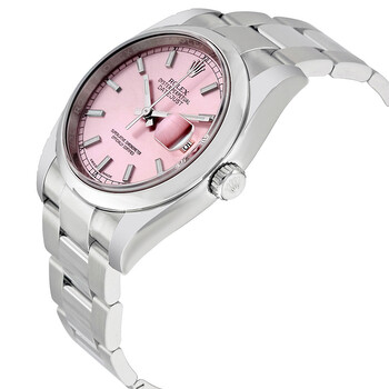 Stainless steel case with a stainless steel Rolex oyster bracelet. Fixed domed stainless steel bezel. Pink dial with silver-tone hands and index hour markers. Minute markers around the outer rim. Dial Type: Analog. Date display at the 3 o'clock position. Automatic movement with a 50-hour power reserve. Scratch resistant sapphire crystal. Screw down crown. Case diameter: 36 mm. Round case shape. Oyster clasp. Water resistant at 100 meters / 330 feet. Functions: date, hour, minute, second. Luxury watch style. Watch label: Swiss Made. Rolex Datejust 36 Pink Dial Stainless Steel Rolex Oyster Automatic Men's Watch 116200PSO.